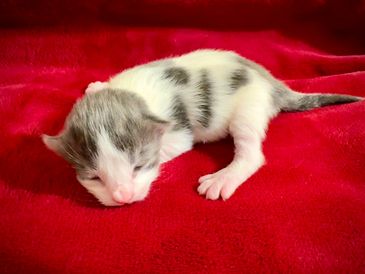 This kitten is a black and white female who is growing in leaps and bounds, and just starting to open her eyes.