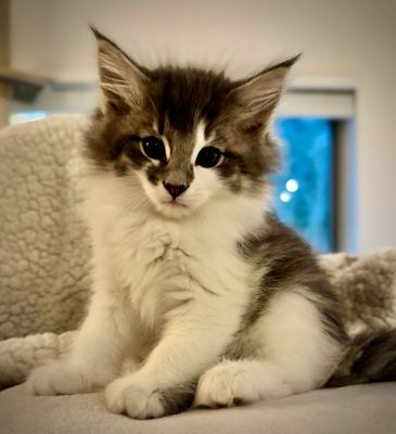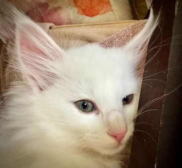Quenna has a beautiful white coat, and her eyes are turning gold like her mama’s. Quenna is active, playful, curious, and busy!
