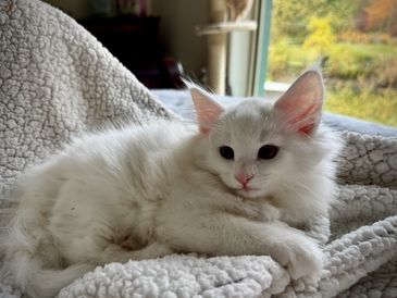 Laufey, or Fey, as she will be known, is a pure white female. She will join Freya, who is also from our cattery, in nearby Black Creek. Lucky Fey!