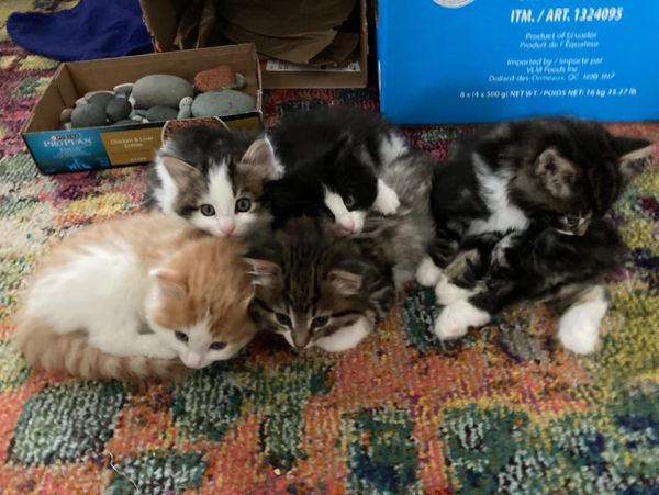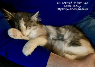 Godiva is living in Toronto with her folks and big brother Zorro. She is sweetness personified, and even after a long trip to Toronto, she purred in her new mama's arms right away, and tried very hard to skip her quarantine week!
