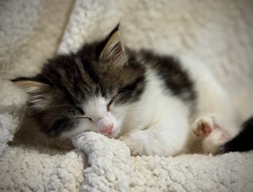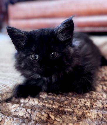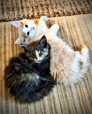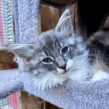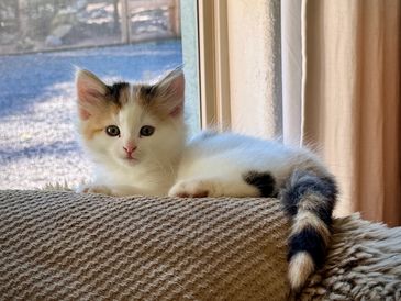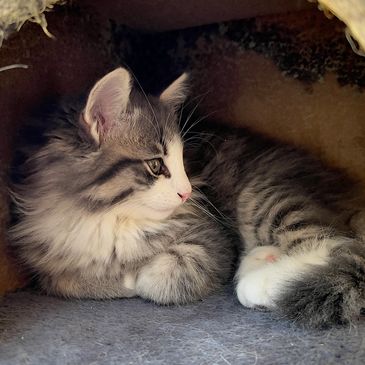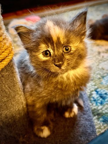 Flash is a blue tortie with white with a lightning blaze on her forehead. She is playful and great at inventing new games with her littermates.