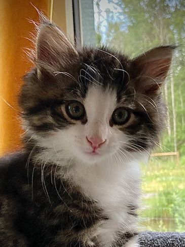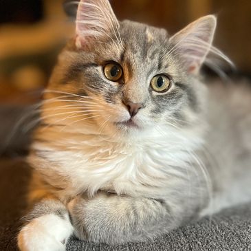 Bjørk lives in Edmonton with her family and Shikoku. She takes good care of her humans, and adores her girls! Bjørk is a perfect Norwegian Forest Cat, and is the mother of the L-Litter (Sired by Snorri).