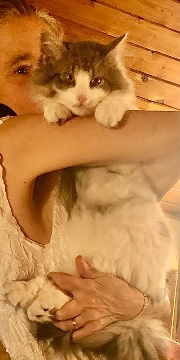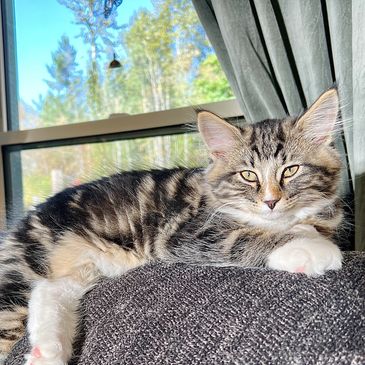 Rasmus is happily spoilt by his folks in Comox, and enjoys his Maine Coon big sister, Priya.