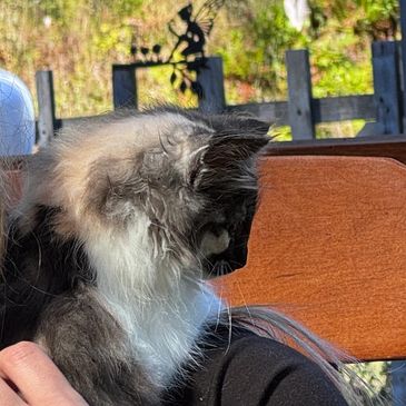 Gryphon is a blue smoke female full of joyful curiousity. She joined her half sister and one of our retirees, and stayed close by in the neighbourhood.