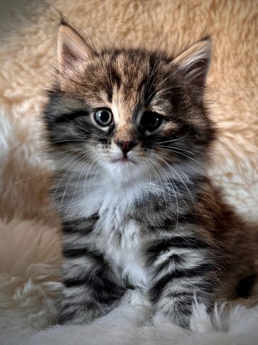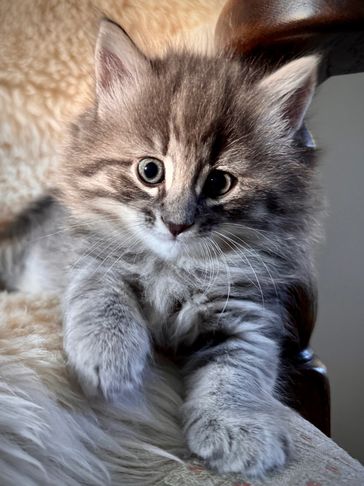 Jordi has moved to Toronto to be the calming, loving companion to a very sweet couple. He is a handsome blue mackerel tabby boy with high white. He looks and acts so much like his sire Snorri, and his great-grandsire, Flóki of PrairieSky Norwegians.