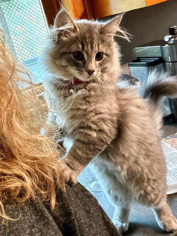 Howl, (aka Fenrir), a big blue with white tabby, joined his Langley family at 14 weeks. His new playmate is a Ragdoll named Mochi.
