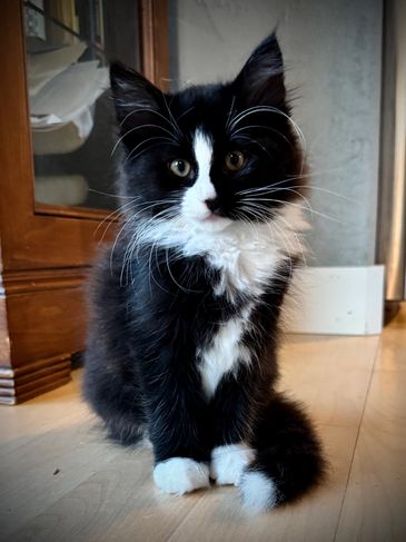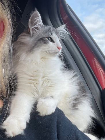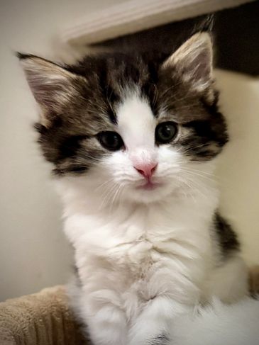 Norden is a gorgeous bue silver tabby with white. He’s found his forever home in North Vancouver, with a Finnish heritage family who love his name!