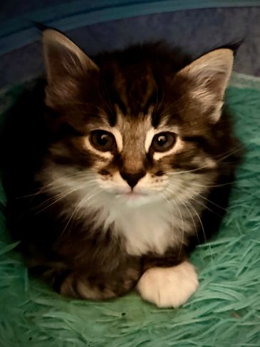 Sedna is a black and white female, personable, feisty, and curious. She’s often the first kitten to explore a new toy or new territory. She‘s a good wrestler too!