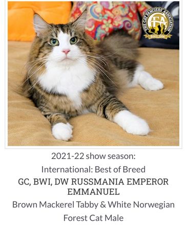 Viking Tails Helios is a cream mackerel tabby with a fabulously even temperament. Helios sired many excellent kittens, including Supreme Grand Champion Alter Quinn Fyrste. We are so happy he now lives just down the road from us!