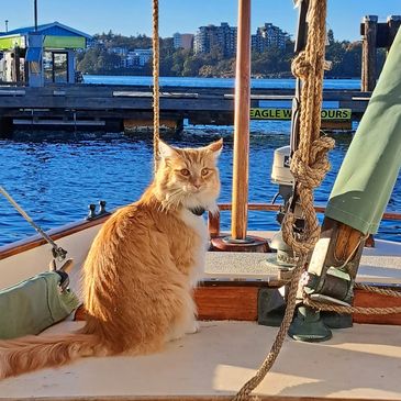 Tordencat Meri is is a red mackerel tabby with white who gave us a single kitten named Orion. Meri’s name means "sea" in Finnish, and coincidentally, her retirement is as a ship's cat on a sailing yacht in the Victoria Harbour. May the winds be always at your back, dear Meri!